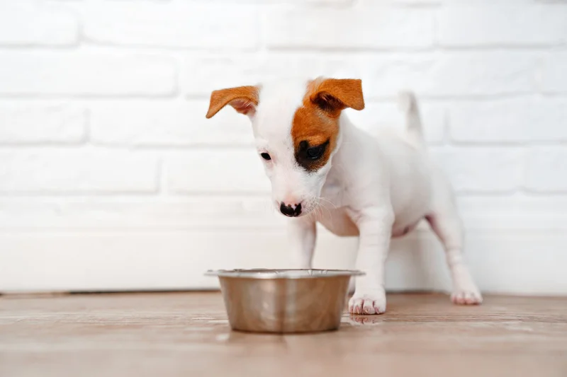 Щенок у миски с кормом. Источник фото: 123rf.com