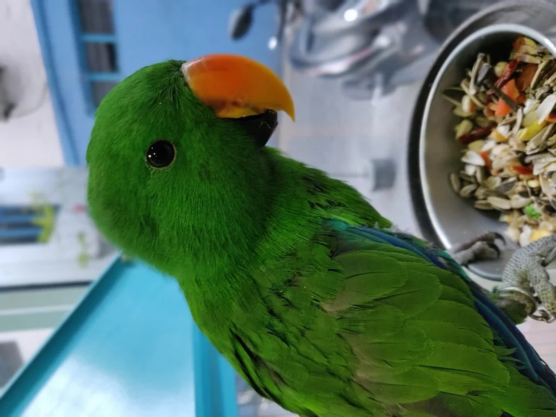Попугай у миски с едой.