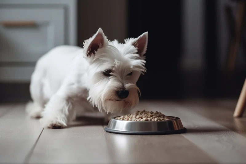 Собака возле миски с сухим кормом. Источник фото: freepik.com