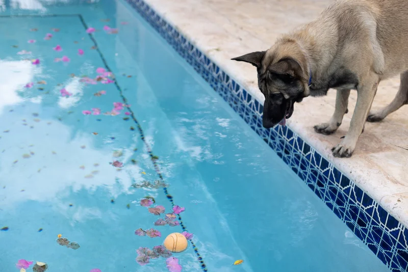 Собака пытается достать игрушку из бассейна. Источник фото: 123rf.com