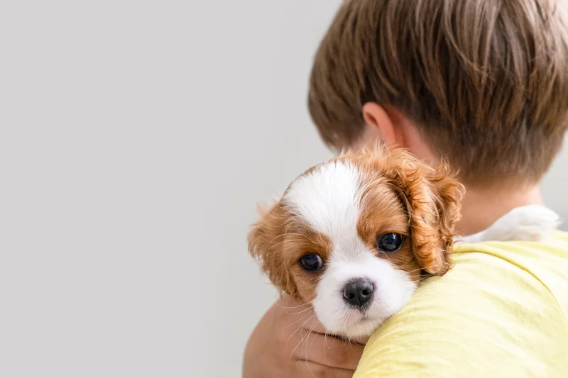 Маленький щенок на руках ребенка.