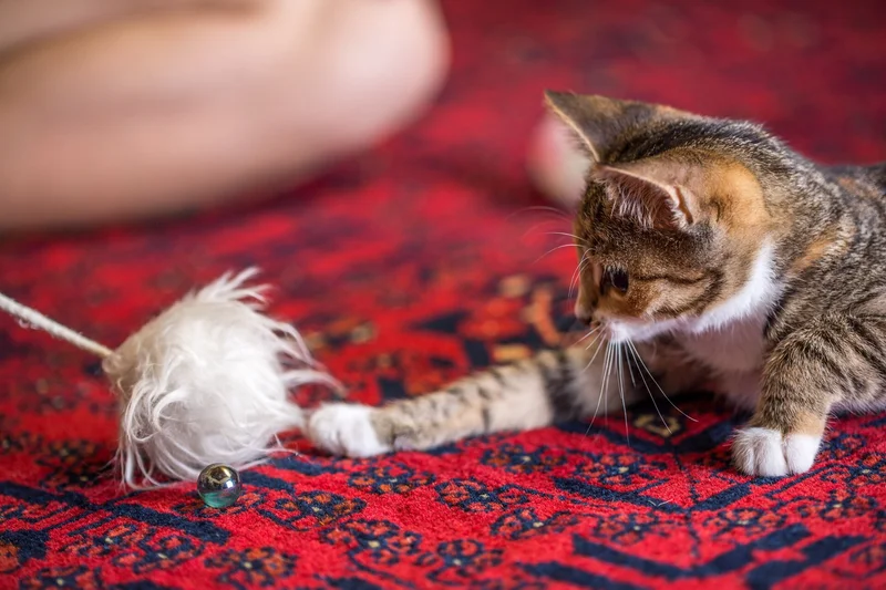 Палочки с перьями и мышками на веревке. Эти игрушки отлично подходят для активных игр. Вы можете водить палочку с перьями по полу, заставляя котенка гоняться за ней, прыгать и хватать. Важно, чтобы котенок ассоциировал охоту и ловлю именно с игрушками, а не с вашими руками.